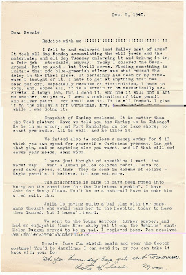 Don’t hesitate to send home the laundry bag. Housecleaning all done now. I have lots of time to cope with socks – gosh! I just remembered – I forgot to include those you mentioned from your drawer. I will send ‘em up + also repair your fur mittens, right soon. This week I have a number of Navy articles to launder. Shall not attempt the family wash unless the weather clears – we have had the beatenest (sic) weather - washings hang on the line days + days – even a whole week, getting wetter. This has been the case time + again. Last week I dried mine in the house, finally.